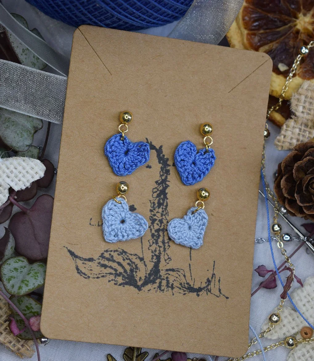 Each tiny heart is expertly crocheted by hand using fine threads in two distinct blue tones, giving you styling options to suit your mood. These earrings are lightweight, delicate, and ideal for everyday wear — whether you lean toward minimalist fashion or playful accessories.