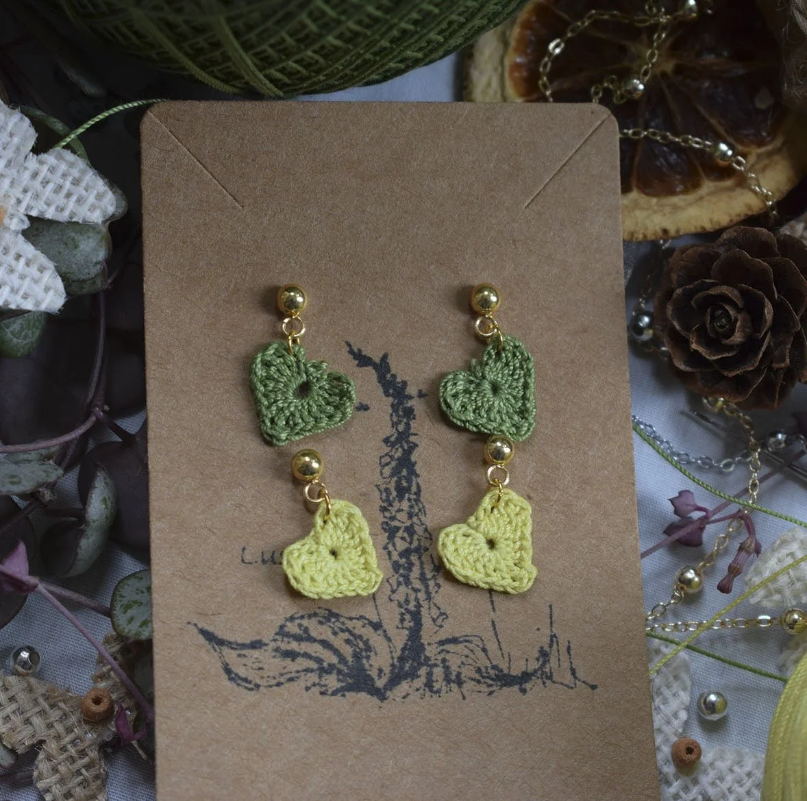 Lovingly handmade, each tiny heart is crocheted with fine thread, making them beautifully lightweight and easy to wear all day. With two shades in one set, you can mix and match to suit your mood, outfit, or season — from fresh spring greens to deeper forest tones.