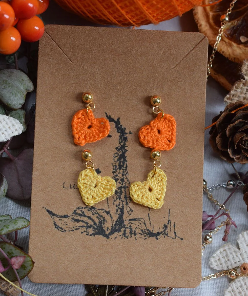 Add a pop of handmade charm to your look with this sweet pair of Orange Micro Crochet Heart Earrings. Crafted with meticulous care, these tiny hearts are made using two warm-toned shades of orange and yellow thread, offering a soft yet vibrant nod to cosy days, autumn colours, and playful style.